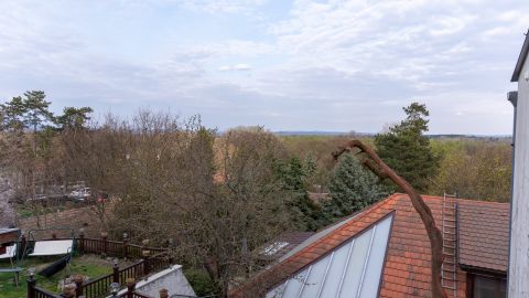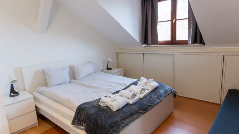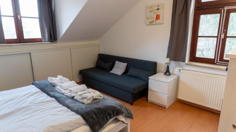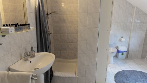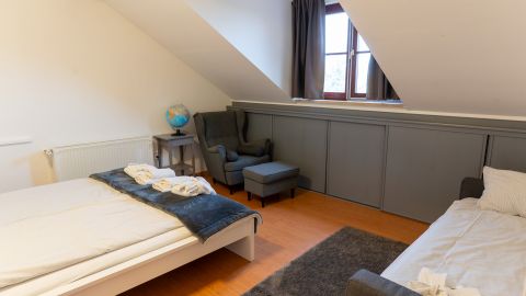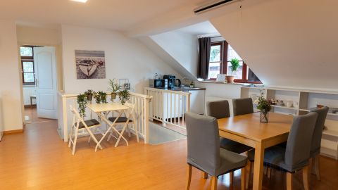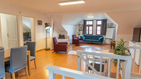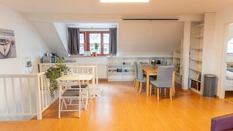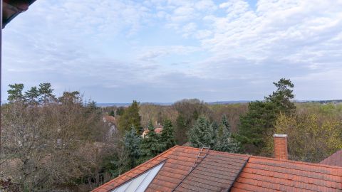 A tetőtérben három tágas szoba, közös fürdőszoba, valamint egy közösségi tér kapott helyet, amely kényelmes lakhatást vagy vendégelhelyezést biztosít.