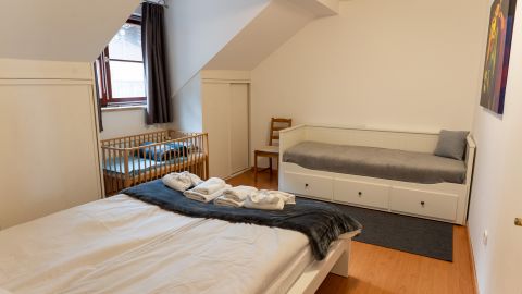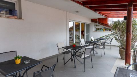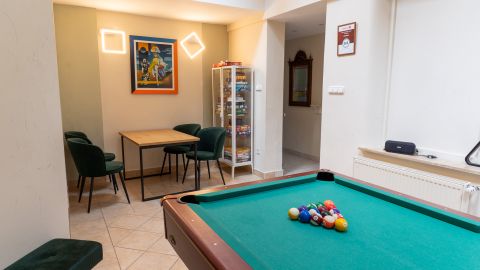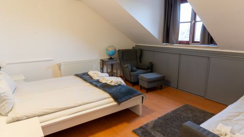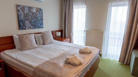 A felette elhelyezkedő két szinten összesen 6 apartman szoba került kialakításra, mindegyik saját fürdőszobával és erkéllyel rendelkezik.