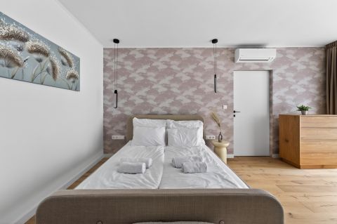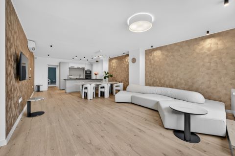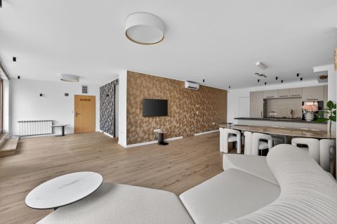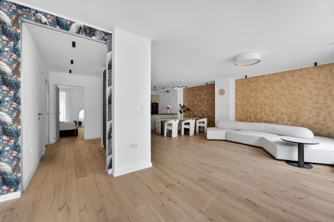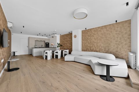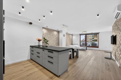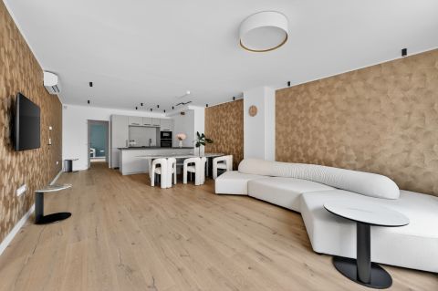 Bent egy **65 m²-es amerikai konyhás nappali** fogad, amely tökéletes helyszíne lehet baráti összejöveteleknek vagy családi alkalmaknak. A tágas térnek köszönhetően egy nagyobb társaság is kényelmesen elfér.