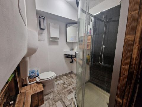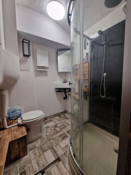 A nappali részből továbbhaladva 2 pici helyiség következik, balra találunk egy zuhanyzós fürdőszobát WC-vel, ami darálós kialakítású, de megbízhatóan működik. Balra egy pici konyha kapott helyet. Továbbhaladva egy tágas, 22 nm-es szobába jutunk, amin ugyan ablak nincs, de hálószobának is kitűnő lehet, mivel elképesztően csendes.